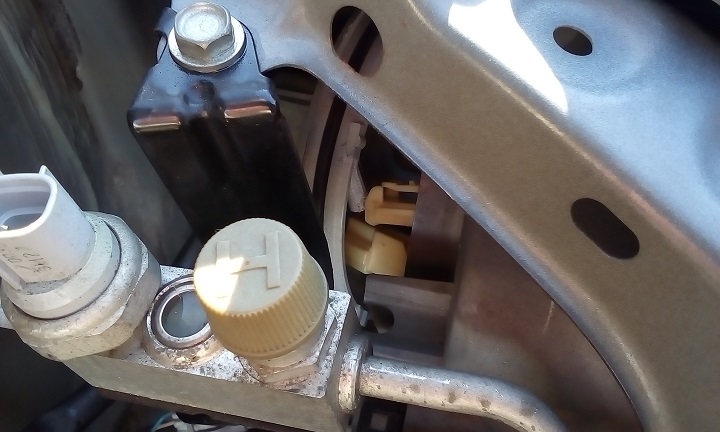 ジャッキアップし、フロントタイヤを外し、インナーカバーをめくることで、タイヤハウス側からのアクセスが可能になる。