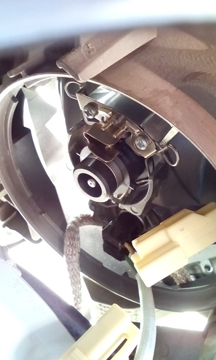 ロービーム用バーナー交換後の画像。ハイビーム取付部などを確認しておく。