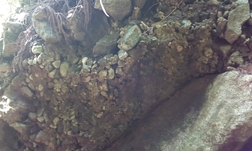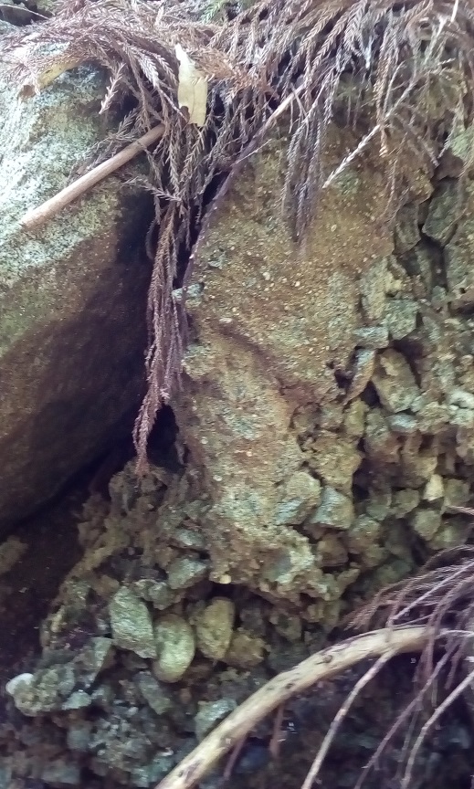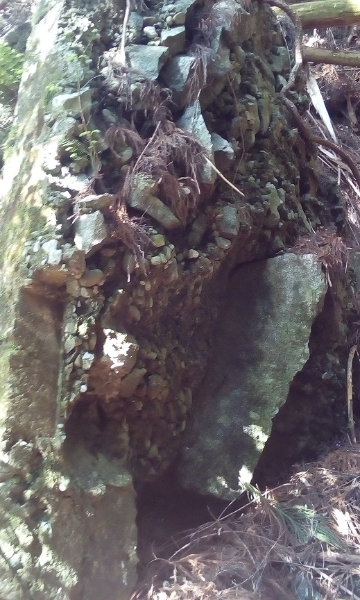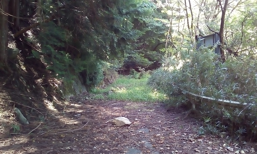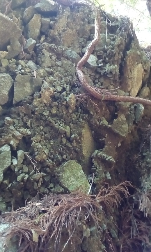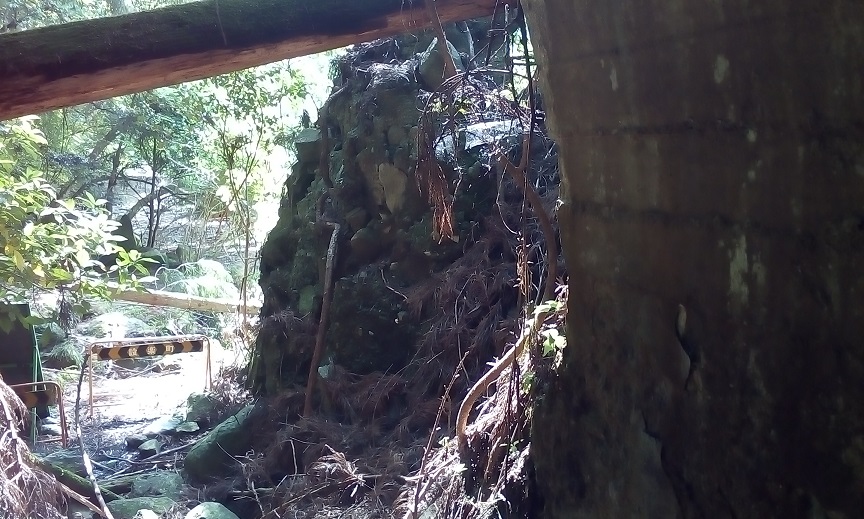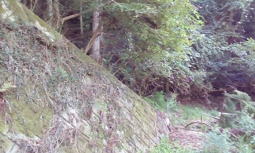 造られたものと推測する。緩んだ斜面からの土砂を防ぐためであろう。現在も残る路盤横の擁壁は石積みである。