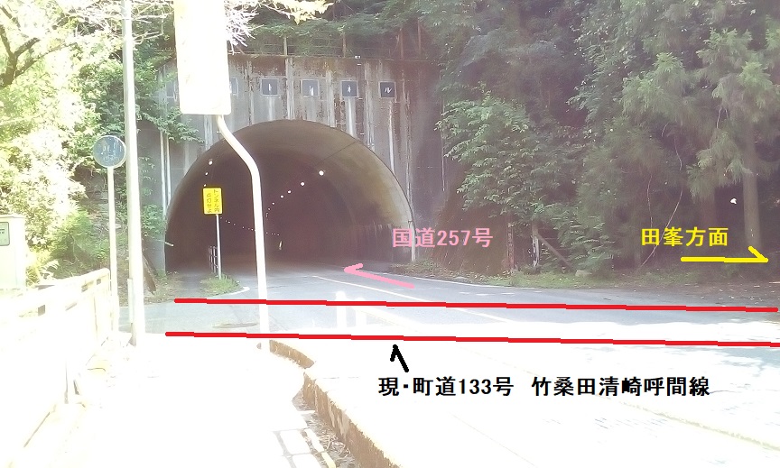 町道133号を田峯方向へ進むと長原前駅跡へ。田口線現存当時はこのトンネルも国道257号も、新清嶺橋も存在せず。