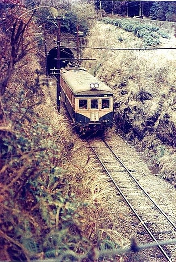 田口線現存当時、稲目隧道南側を出て滝上停留所へ向かう列車。