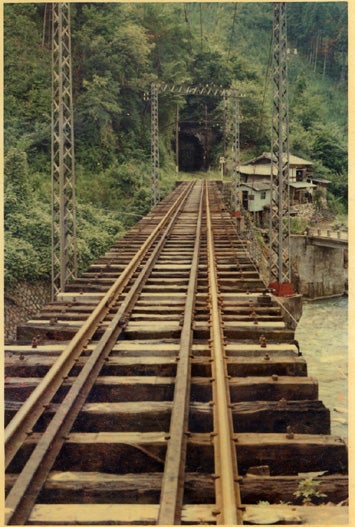 当時の画像。稲目隧道を出て滝上停留場へ向かう上り列車。田峯方面を望む。