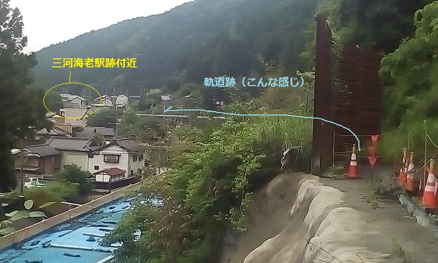 三河海老駅(停車場)から山の斜面沿いに海老の街並みを見下ろしながら田口線は滝上停留所へと続いてゐた。軌道跡は現・県道32号の拡幅工事に伴いその多くを失ってしまったが、