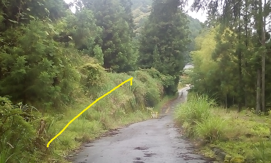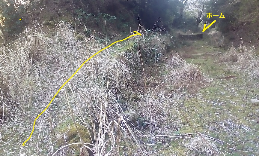 ホームへアクセスする道(黄線)。県道側から「けもの道」のやうに続いている。