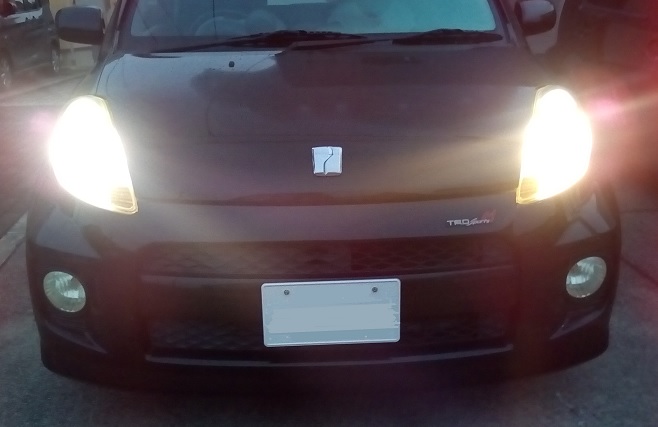 右側のみ交換後の状態。左側(純正バルブ)の色味が若干黄色がかっているのが分かる。