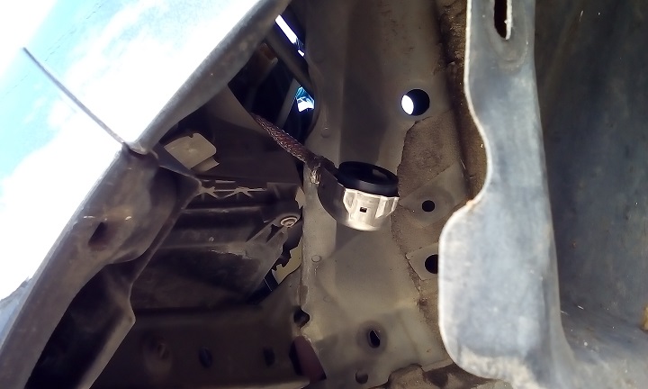 ジャッキアップし、フロントタイヤを外し、インナーカバーをめくることで、タイヤハウス側からのアクセスが可能になる。