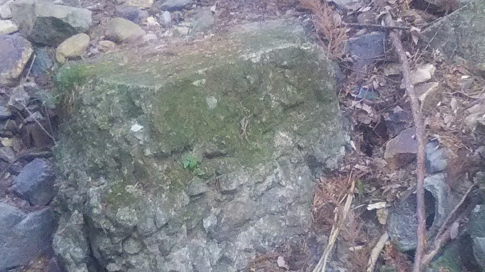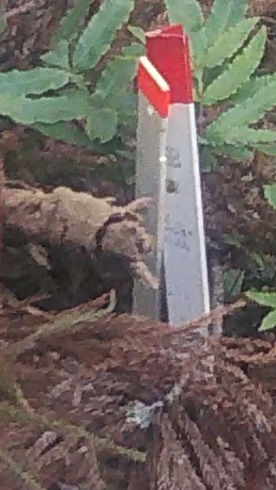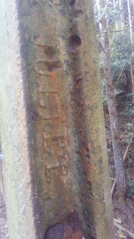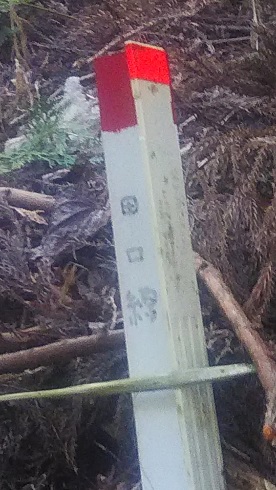 境界標とは異なるが、廃線後測量時に田口線跡を示したもの。峰第四隧道を出て、傘川橋梁跡へ向かう途中にある。